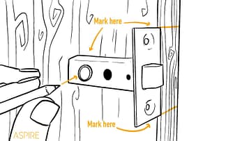 You should mark horizontal lines along the door’s edge showing the top and bottom of the latch face plate, and then the latch mechanism itself. With the latch still in place, mark the spindle holes to show where the door handle will sit.