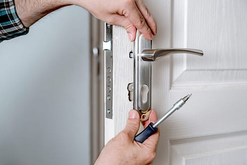 Door lock installation, repair, or replacement service. Door hardware installer locksmith working with open white door indoor. Hands of the master close-up