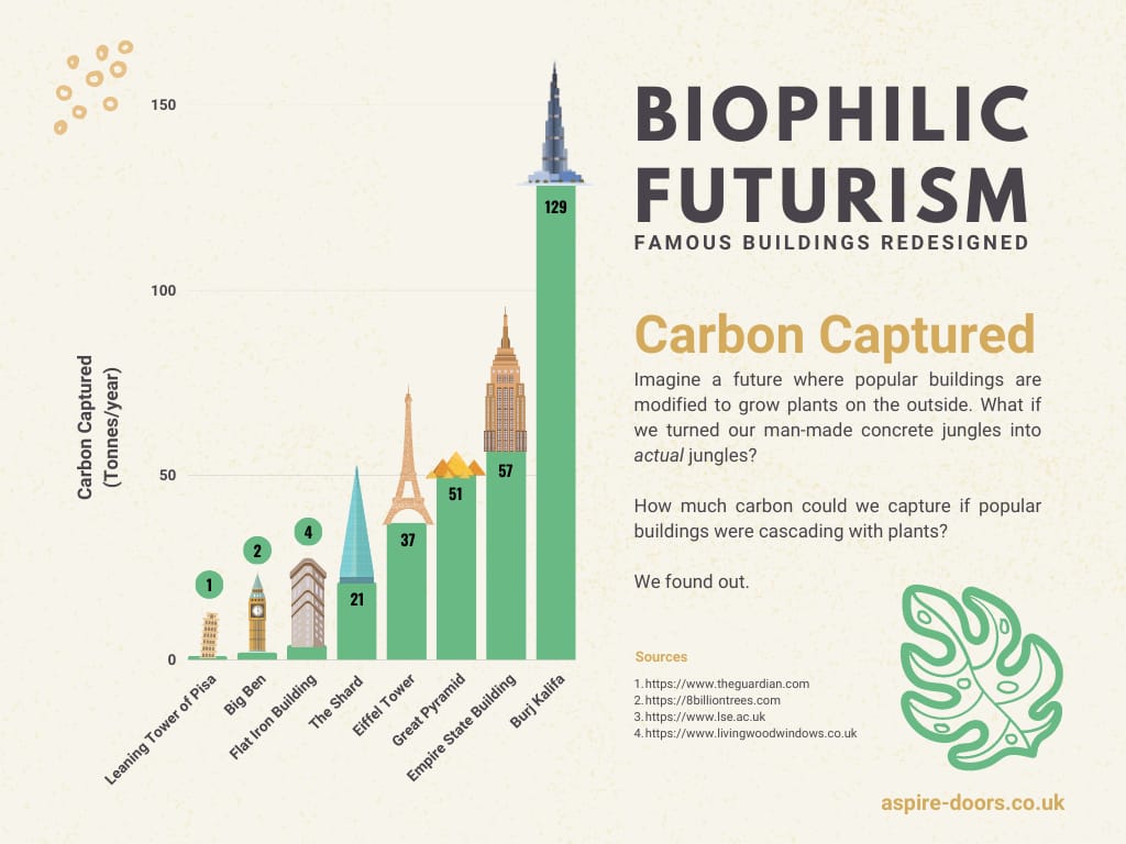 We’ve taken 8 popular buildings around the world and used science and maths to calculate how much carbon we could capture every year if we covered 75% of the surface of these buildings in photosynthesising plants.