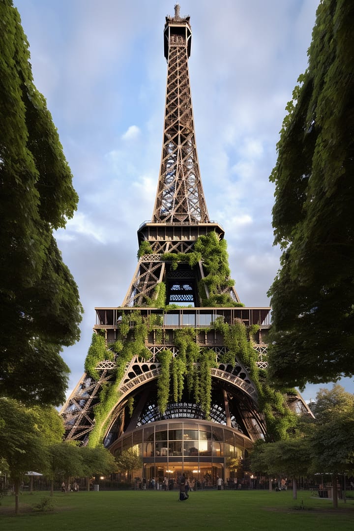 The AI decided to place a beautiful walking garden under the tower – and looks like it straightened the building out while it was at it. While not historically sensitive, this version of The Leaning Tower of Pisa is a great example of what buildings could look like if we engineer them to support plant growth.