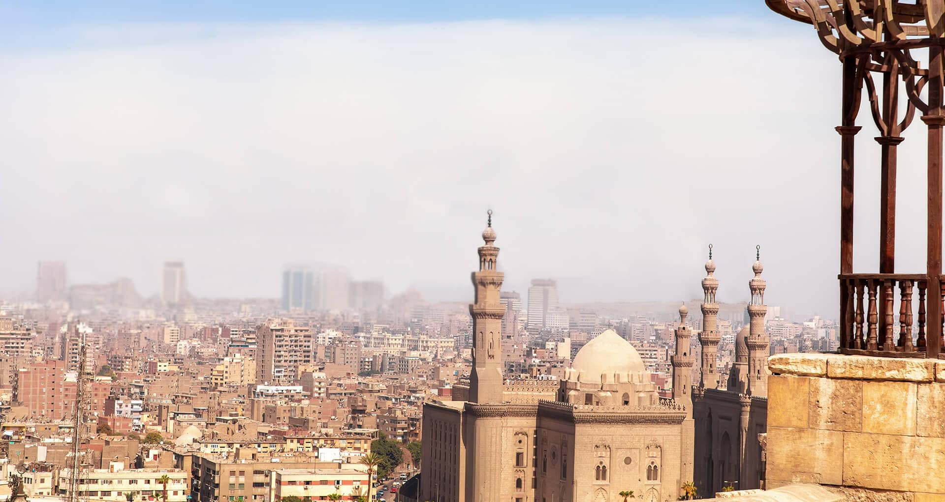 The missing landmark from this skyline is the Pyramids of Giza.