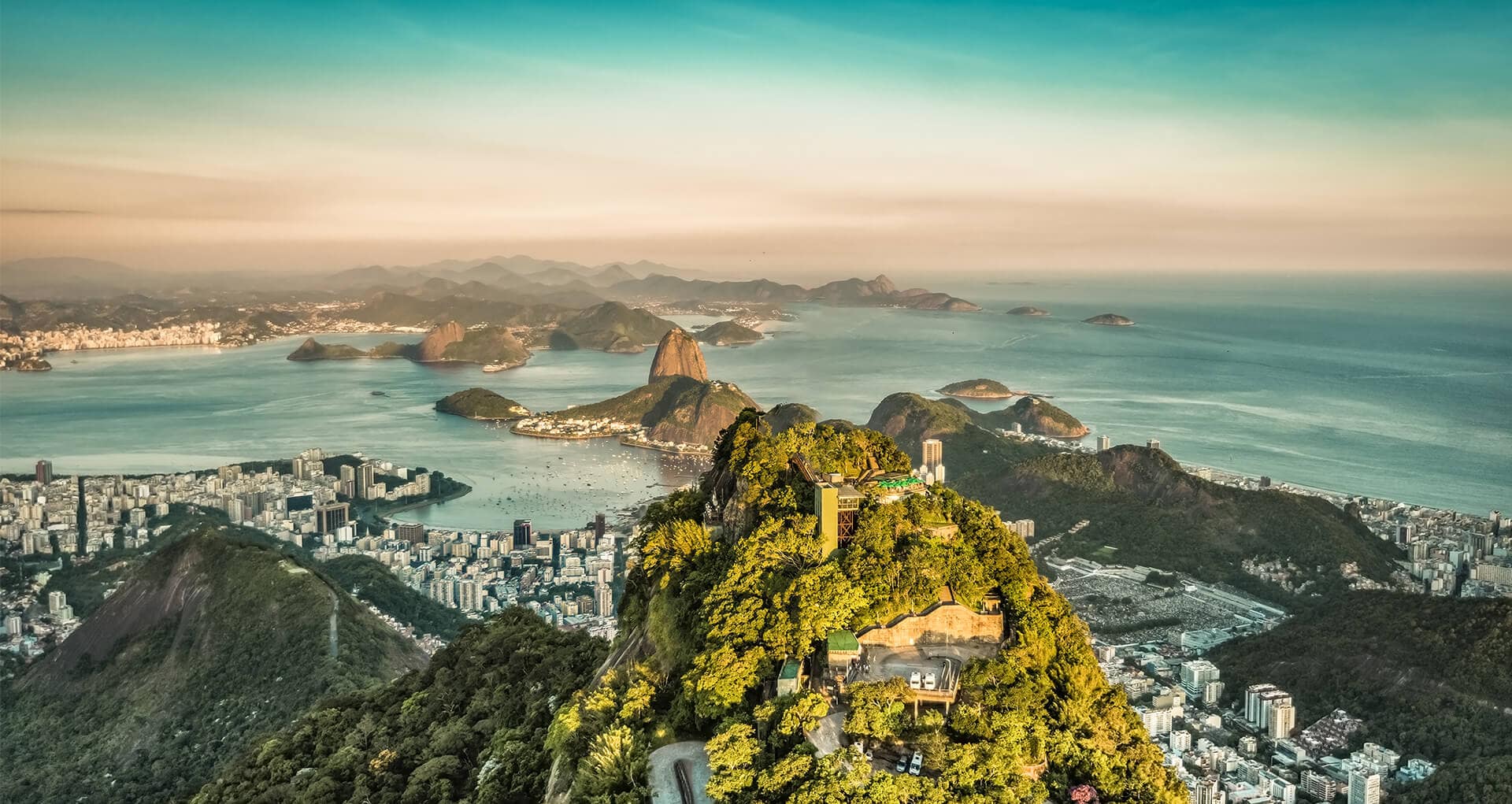 The missing landmark in this skyline is Christ the Redeemer.
