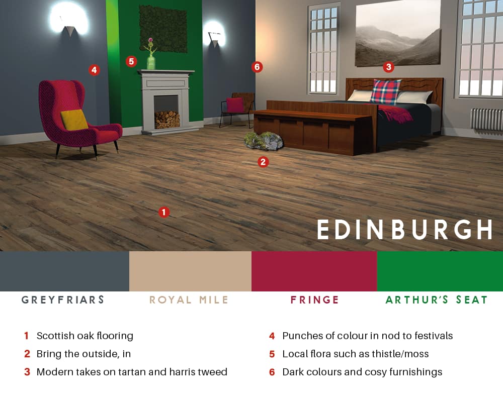 For our Edinburgh-inspired room, we’ve gone for Scottish Oak flooring. The colour scheme hits all those Scottish notes with deep purples, moss greens and more. Add in a couple dashes of brighter colours for accentuation and of course, some modern versions of the traditional Scottish tartan and Harris tweed patterns. The Scottish weather can be very unforgiving, so warmth and cosiness are the main things to keep in mind to get it right.