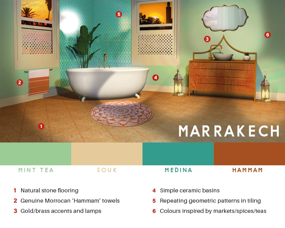 We’ve decided to opt for a Moroccan bathroom, with natural stone flooring and bright punchy colours. We’ve been inspired by the markets and spices of Morocco, set against muted North African neutrals. Marrakech is known for its textiles and we’ve added some geometric patterning alongside gold accents and details to keep it perfectly on theme. Simple ceramic basins for the bath and sink are a pleasant mixture of modern minimalism with a nod to the Marrakech aesthetic.
