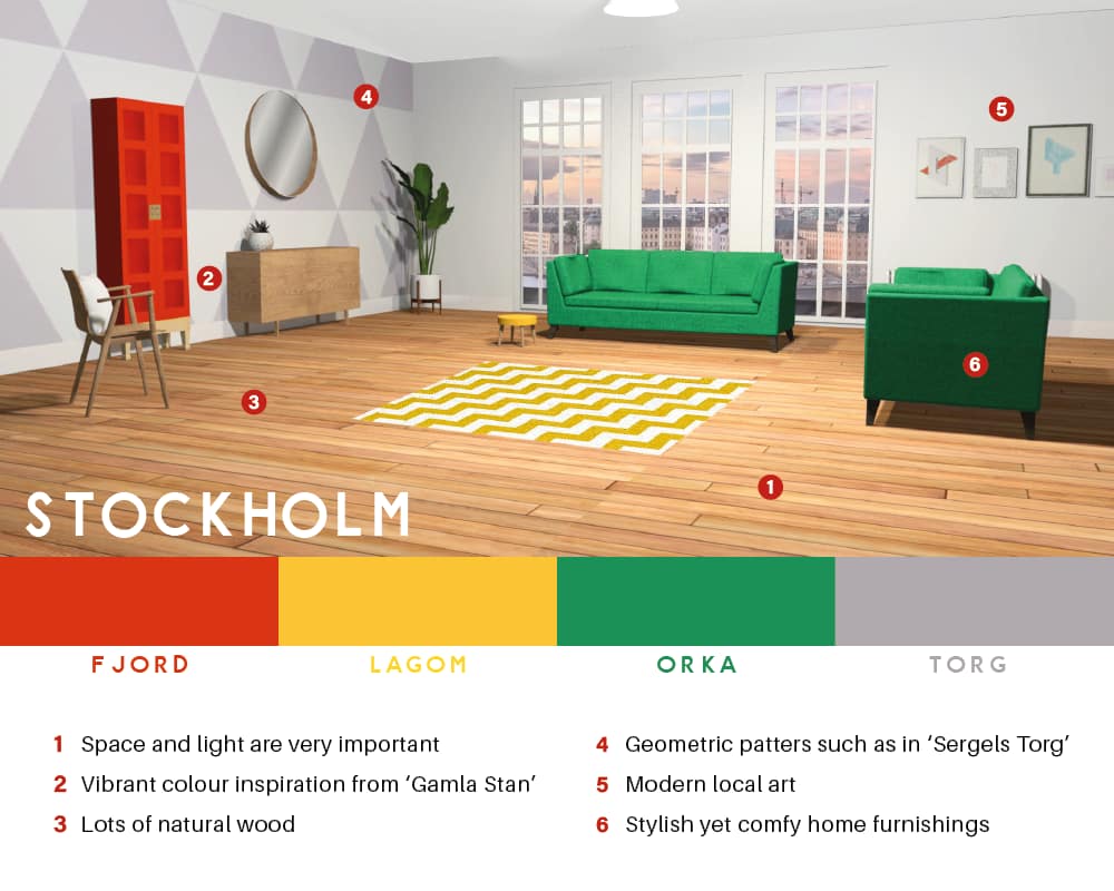 A couple of the main things to keep in mind when designing a Stockholm-inspired room are space and light. Filled with natural wood features and vibrant colours, the furnishings are also carefully curated to meet those two overarching maxims of Scandinavian design: comfort and style. Really simple geometric patterning gives it extra depth and some modern local art adds to the vibrancy of the walls.