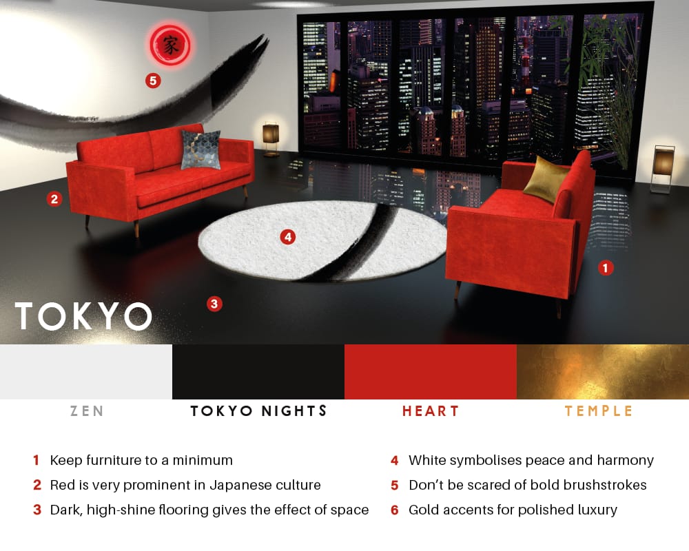 For our Tokyo-inspired room, we have Western decadence meeting Japanese minimalism and symbolism. Furniture is to be used sparingly and you’ll notice bold lashings of red and white. When these colours are juxtaposed, it symbolises happy or auspicious occasions and red especially is a prominent colour in Japanese culture. Gold accents represent that embracing of some Western culture where displays of personal luxury are encouraged. In Japan, they take a slightly more humble approach to luxury in the home. Altogether, you have a really great-looking room that nails the Japanese look and feel.