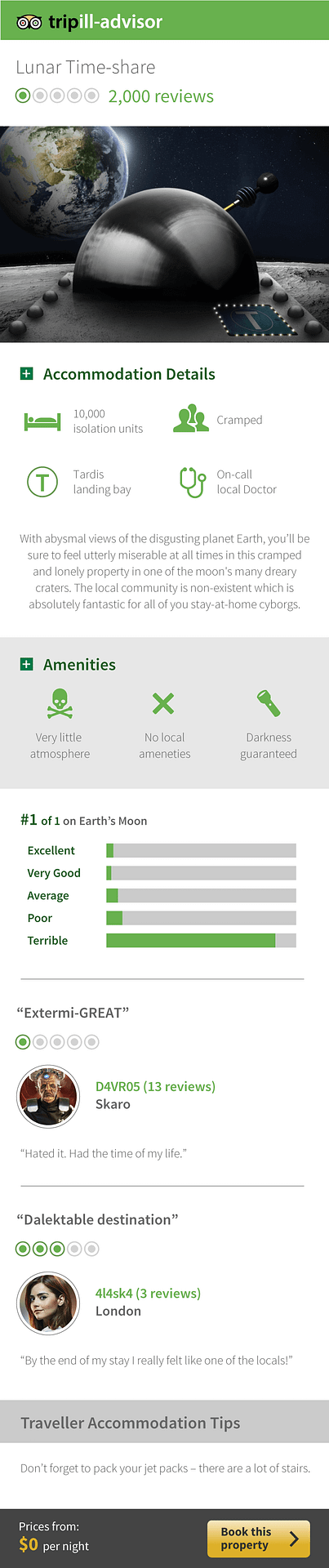 Perfect if you’re looking to exterminate all but the dalek race, this is the one home that you’ll love every moment of hating.