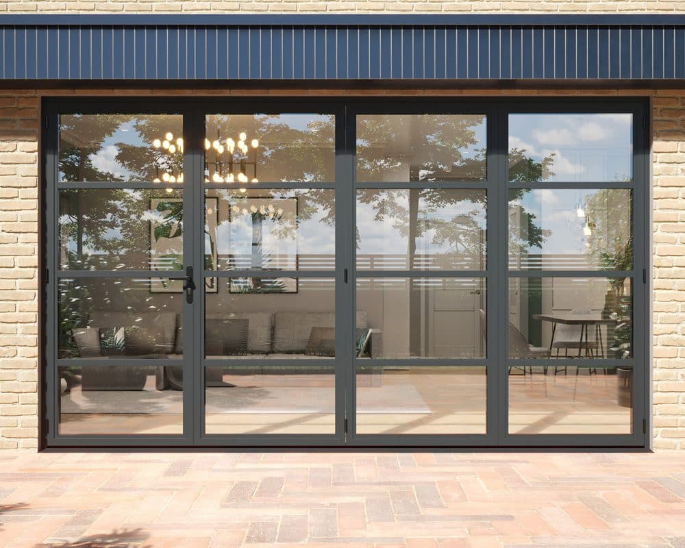 Our range of Revere Grey Industrial external bifolds blends the popular aluminium finish of anthracite grey with the in-demand style of steel look doo...