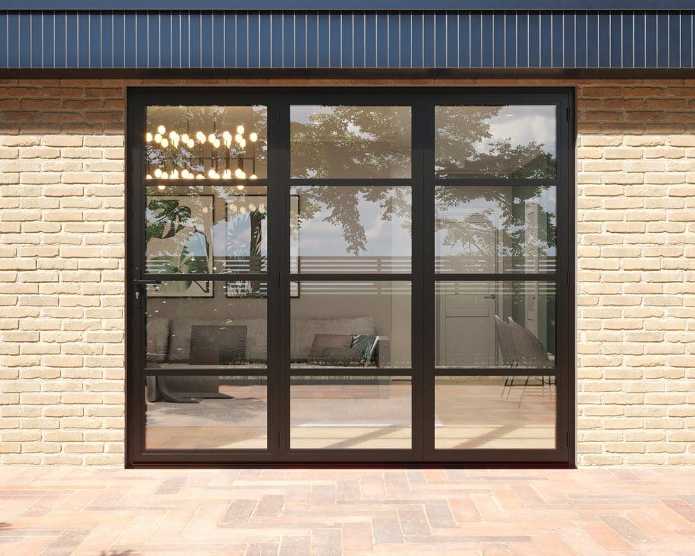 Our Revere Industrial bifolds combine the iconic feel of heritage style steel doors with the attainability of aluminium. Black powder coated aluminium framing makes for a lightweight and more cost effective alternative to steel, while 40mm glazing bars on the surface of the glass help complete the sleek industrial design.