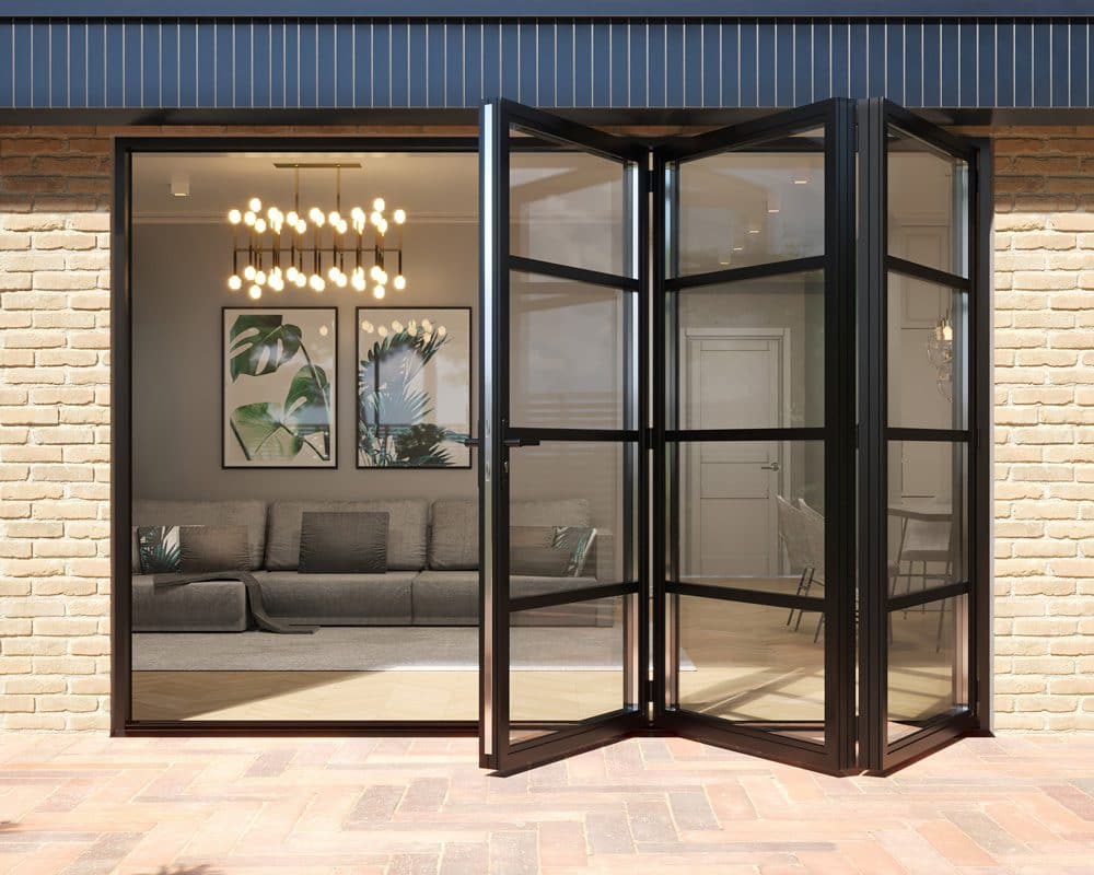 Our Revere Industrial bifolds combine the iconic feel of heritage style steel doors with the attainability of aluminium. Black powder coated aluminium framing makes for a lightweight and more cost effective alternative to steel, while 40mm glazing bars on the surface of the glass help complete the sleek industrial design.