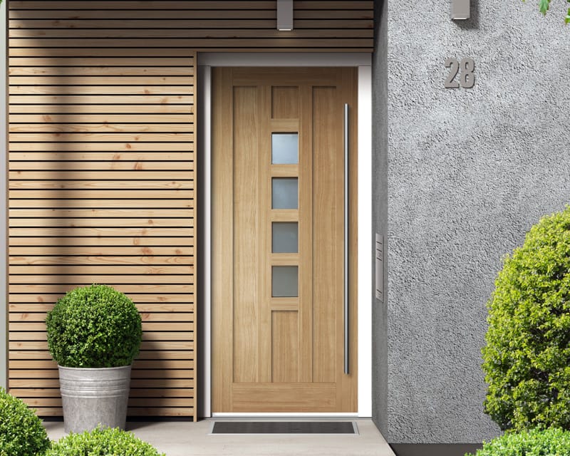 Our Newton front door has an engineered timber core that provides stability and durability, while real oak veneers are ready to take your chosen paint or stain in any chosen colour. 4 obscure glazed panes allow some light through while keep your all important privacy in tact.