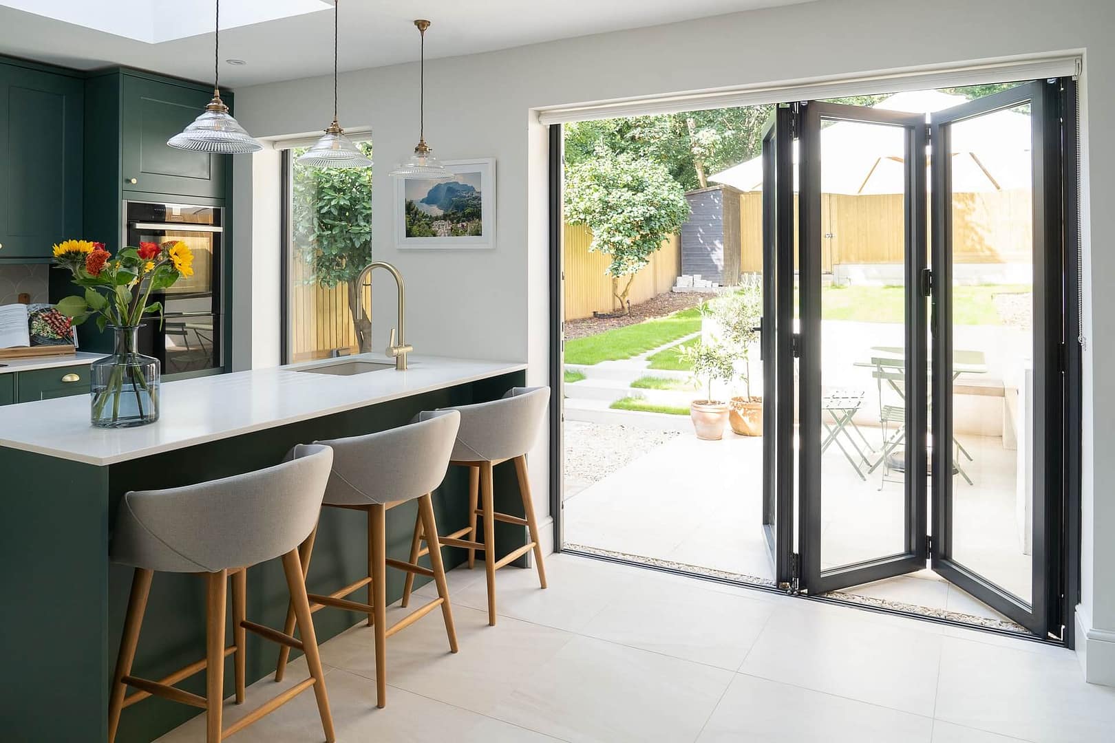 And if you are into the current trend for industrial design, black primed bi-fold doors, particularly glazed ones, can slip seamlessly into this style. They make a great alternative to expensive Crittal style windows, with their sharp black lines.