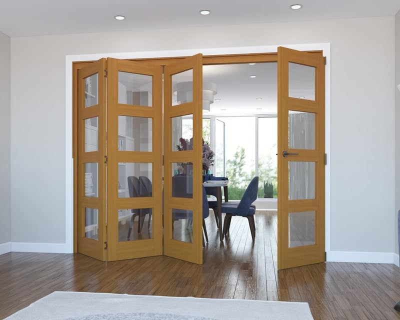 ExploreOur Vision Fully Finished Oak 4 Light range provides you with interchangeable space in a flawless finish. Fold back the doors if you’re entertaining guests, or keep them shut for some much needed privacy, still allowing light to flood through thanks to the 4 panes of glass per door. Supplied with a factory-applied stain system, these doors are ready to hang straight out of the packaging.