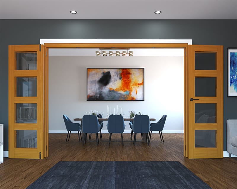 The Calibre’s hardware allows you to fold the doors back flat 180 degrees when fully opened. This means you can make the most of connecting two areas without having doors taking up valuable space by protruding into either room. Day to day, the handled panel can be used as a daily access door, with the side leaves staying shut until you release the shootbolts to open them up.